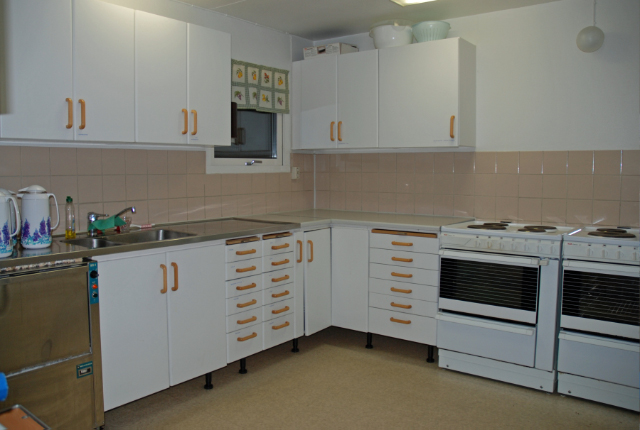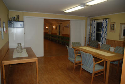 | Kök med två spisar och storköksdiskmaskin, porslin och glas | Samling/serveringsrum. Plats för mindre möten. I anslutning till köket. | Stora salen. |